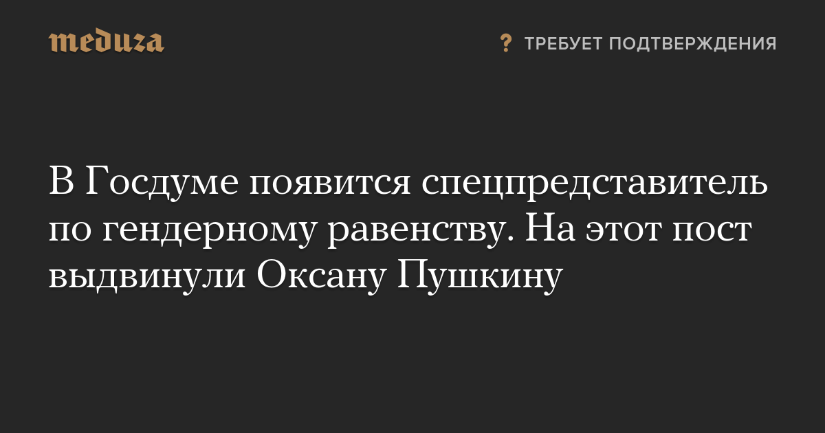 В Госдуме появится спецпредставитель по гендерному равенству. На этот пост выдвинули Оксану Пушкину