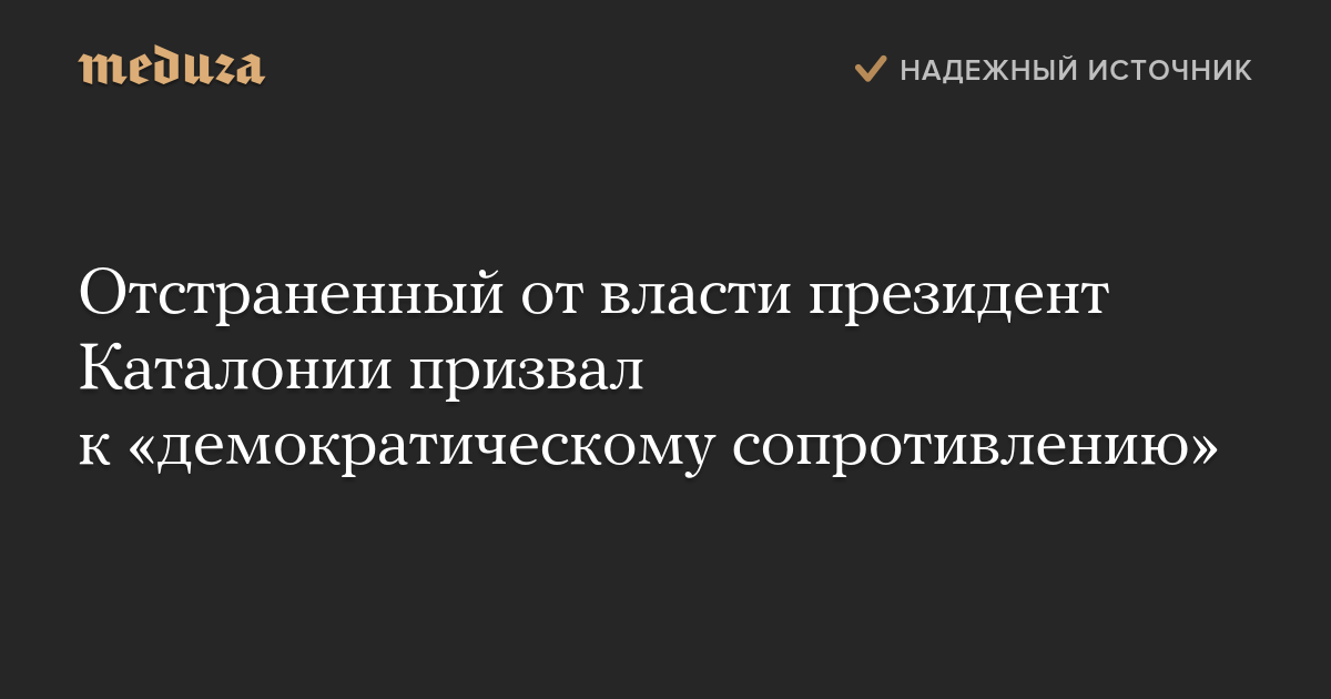 Президент Каталонии Карлес Пучдемон, отстраненный от власти решением правительства Испании, выступил с обращением, в котором призвал каталонцев к «демократическому сопротивлению» внешнему управлению в регионе.