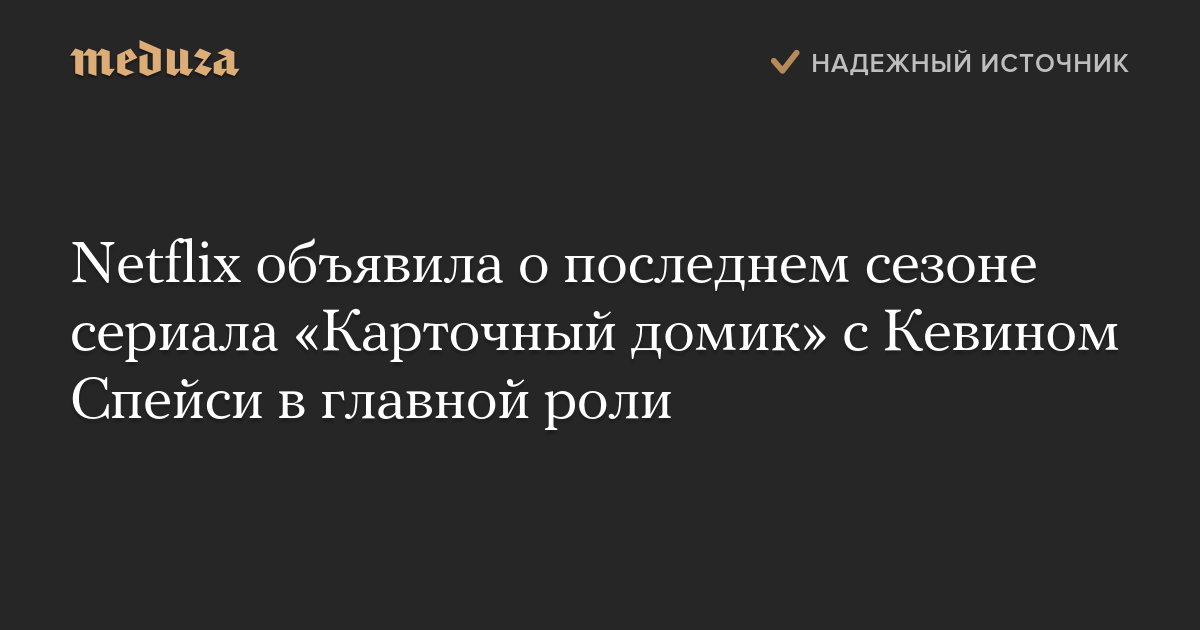 Компания Netflix объявила, что шестой сезон сериала «Карточный домик», одну из главных ролей в котором играет Кевин Спейси, станет последним.