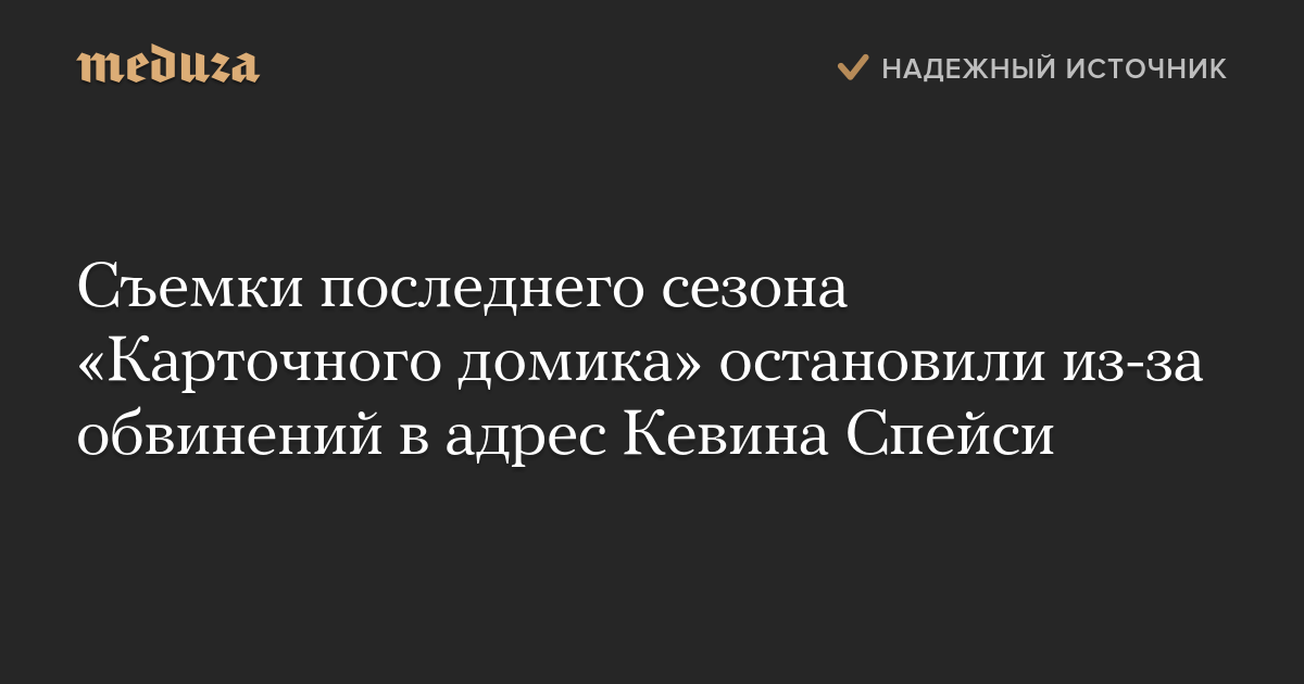 Сервис Netflix и телестудия MRC заморозили съемки последнего, шестого сезона сериала «Карточный домик» после обвинений в домогательствах, выдвинутых в адрес исполнителя главной роли, актера Кевина Спейси.