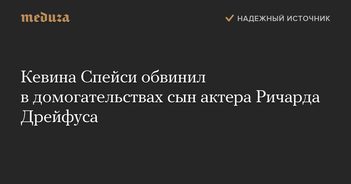 Актер Гарри Дрейфус, сын обладателя «Оскара» Ричарда Дрейфуса, написал для Buzzfeed о том, как в 18-летнем возрасте столкнулся с домогательствами Кевина Спейси. Издание отмечает, что слова Гарри подтвердили пять человек, которым он рассказывал о случившемся, в том числе его отец и брат.