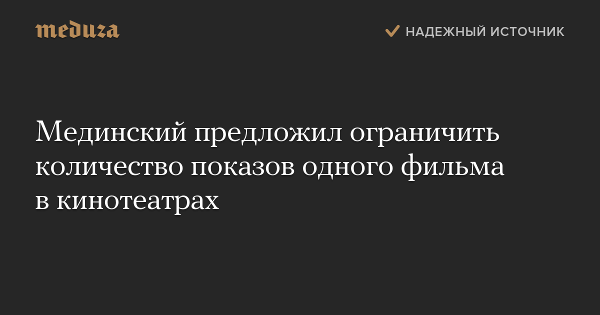 Министр культуры Владимир Мединский предложил запретить кинотеатрам выделять более 35% сеансов под один фильм.