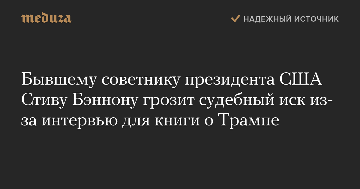 Бывшему советнику президента США Стиву Бэннону грозит судебный иск из-за комментариев, которые он дал Майклу Вулфу — автору книги об администрации Дональда Трампа.