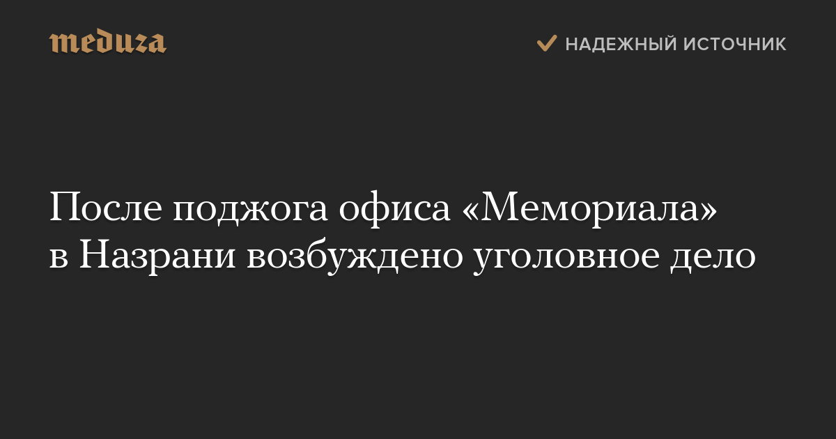 МВД по Ингушетии возбудило уголовное дело об умышленном уничтожении или повреждении имущества (статья 167 УК РФ) после пожара в офисе правозащитной организации «Мемориал» в Назрани, сообщает РИА Новости.