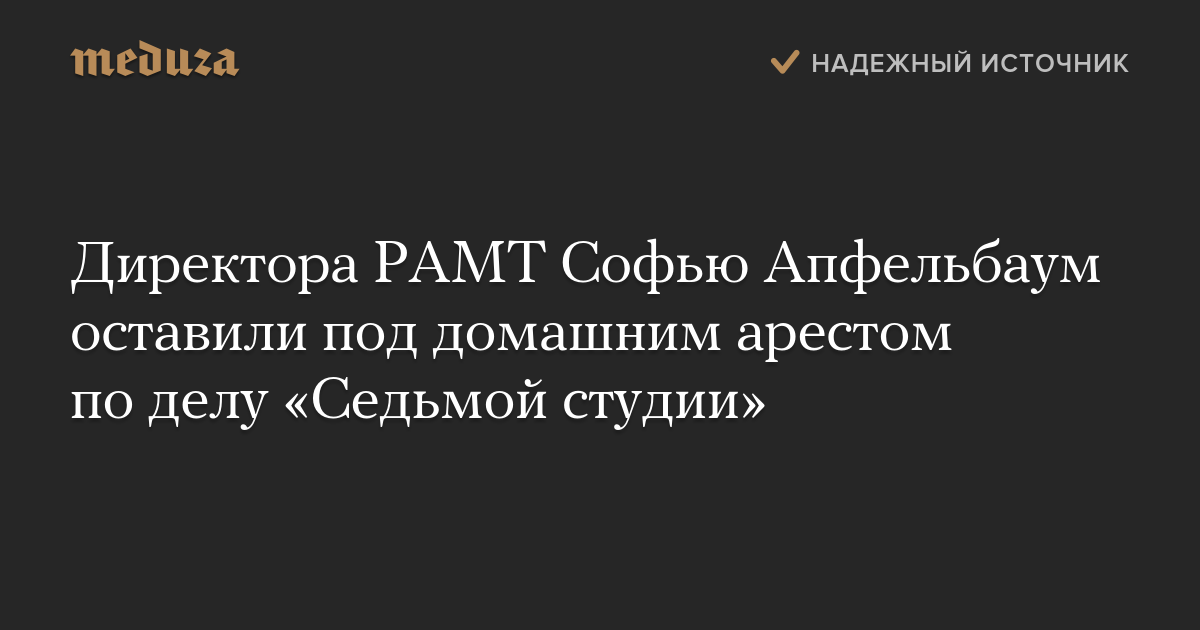 Мосгорсуд оставил под домашним арестом до 19 апреля директора Российского академического молодежного театра (РАМТ) Софью Апфельбаум, обвиняемую по делу о хищении бюджетных средств «Седьмой студией».