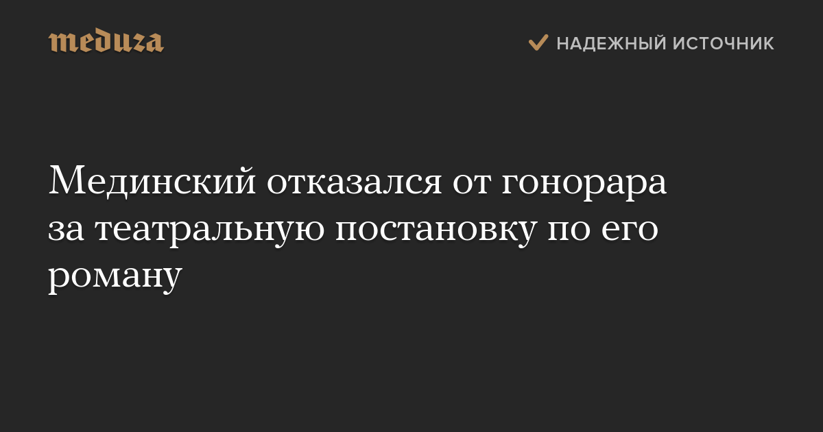 Министр культуры РФ Владимир Мединский отказался от гонорара за будущий спектакль в Малом театре, который будет поставлен по его роману «Стена», сообщает РБК со ссылкой на пресс-службу министерства.