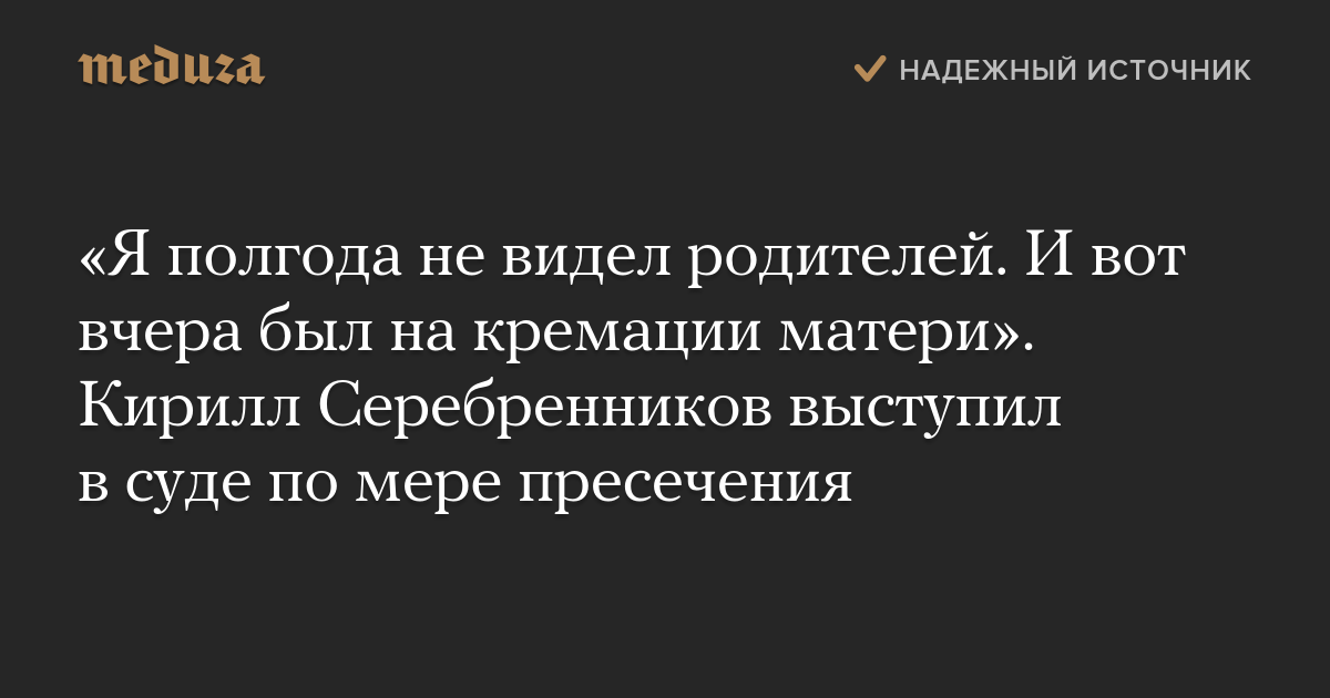 «Я полгода не видел родителей. И вот вчера был на кремации матери», — сказал Серебренников, выступая в Мосгорсуде, который рассматривает жалобу на продление меры пресечения обвиняемым по делу «Седьмой студии».