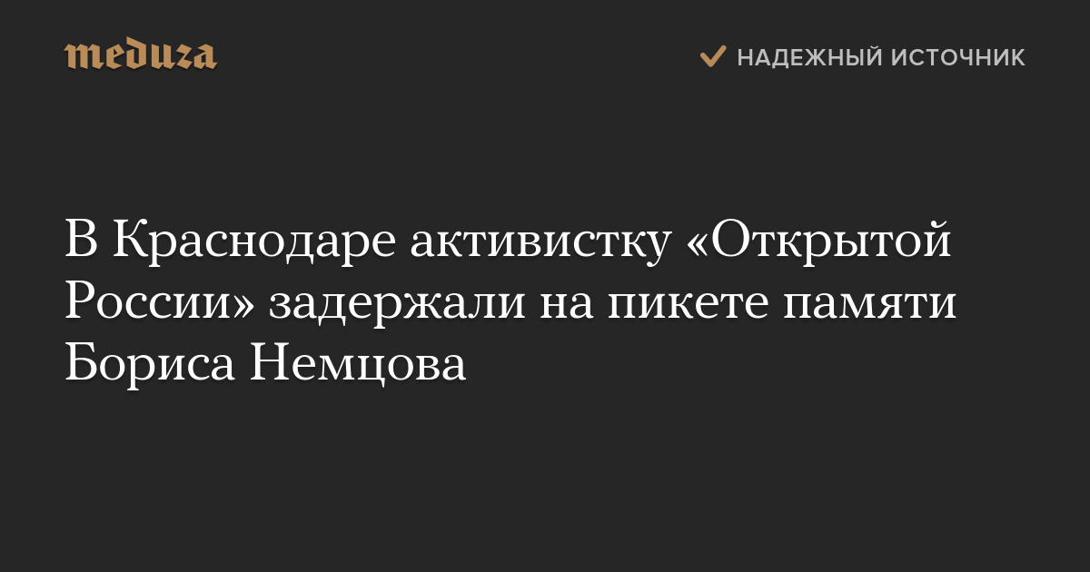 В Краснодаре 27 февраля полиция задержала координатора «Открытой России» Яну Антонову, которая проводила одиночный пикет памяти Бориса Немцова с плакатом «Герои не умирают».