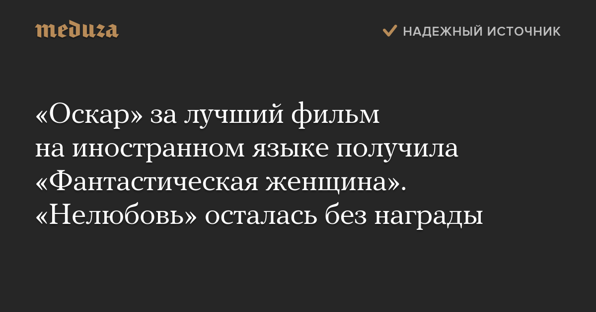 «Оскар» за лучший фильм на иностранном языке получила «Фантастическая женщина». «Нелюбовь» осталась без награды