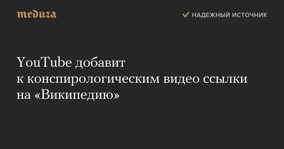 Видеосервис YouTube будет добавлять к роликам с конспирологическими теориями текстовые блоки со ссылками на статьи в «Википедии» об описываемых событиях. Об этом объявила на конференции South by Southwest (SXSW) в Остине, штат Техас, глава видеосервиса Сьюзен Войжитски.