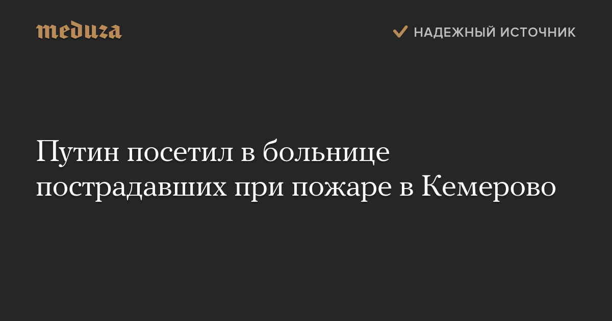 Путин также приехал в здание судмедэкспертизы, где провел «незапланированную встречу с инициативной группой граждан, которые высказывали недоверие к ходу расследования пожара», добавляет агентство. Он посоветовал собравшимся не верить недостоверной информации о количестве погибших при пожаре, распространяемой в социальных сетях.
