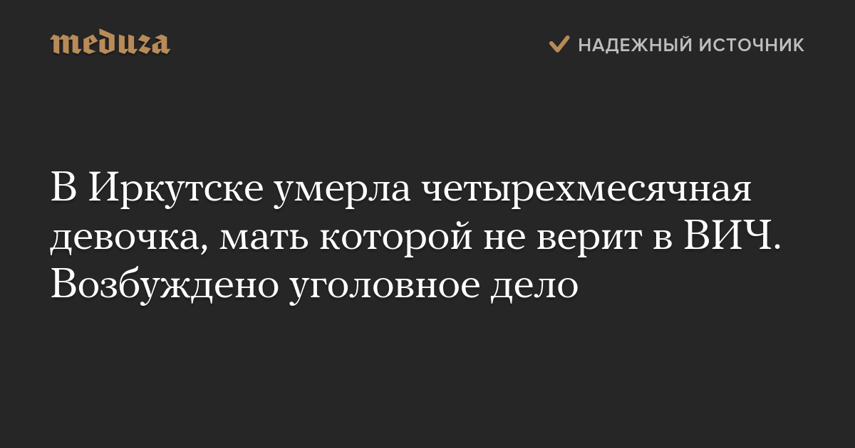 Следственный комитет возбудил уголовное дело после смерти в иркутской больнице четырехмесячной девочки, мать которой отказывалась лечиться от вируса иммунодефицита человека (ВИЧ). Дело возбуждено по статье о причинении смерти по неосторожности.