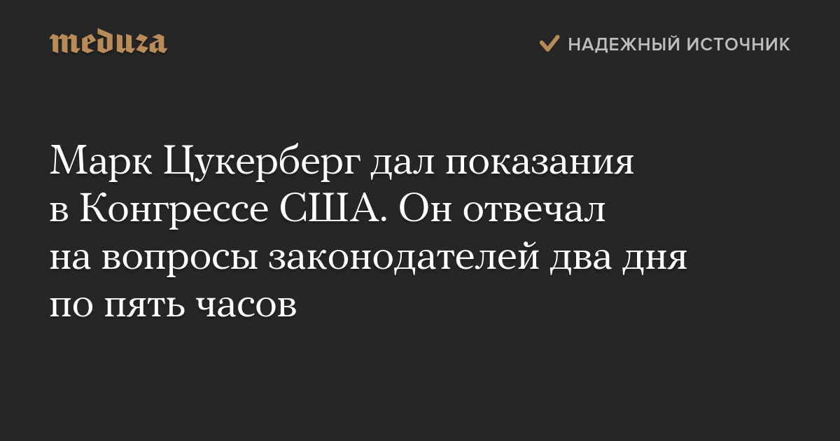 Основатель Facebook Марк Цукерберг закончил давать показания в Конгрессе США. Слушания длились два дня подряд; каждый день Цукерберг отвечал на вопросы законодателей на протяжении примерно пяти часов.