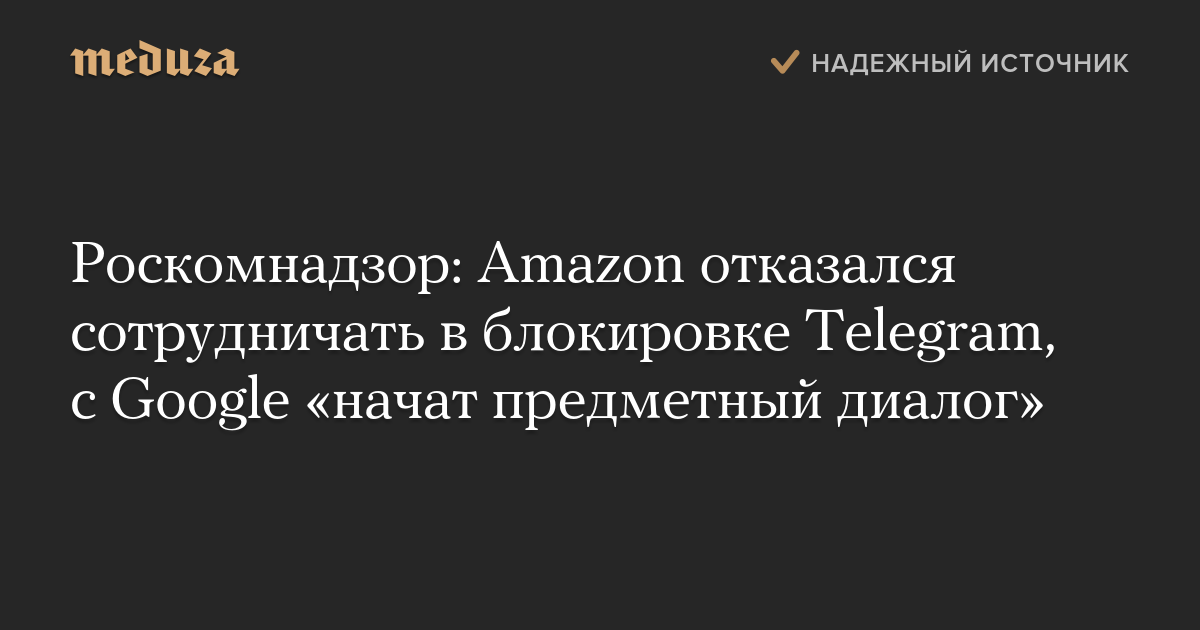Роскомнадзор: Amazon отказался сотрудничать в блокировке Telegram, с Google «начат предметный диалог»