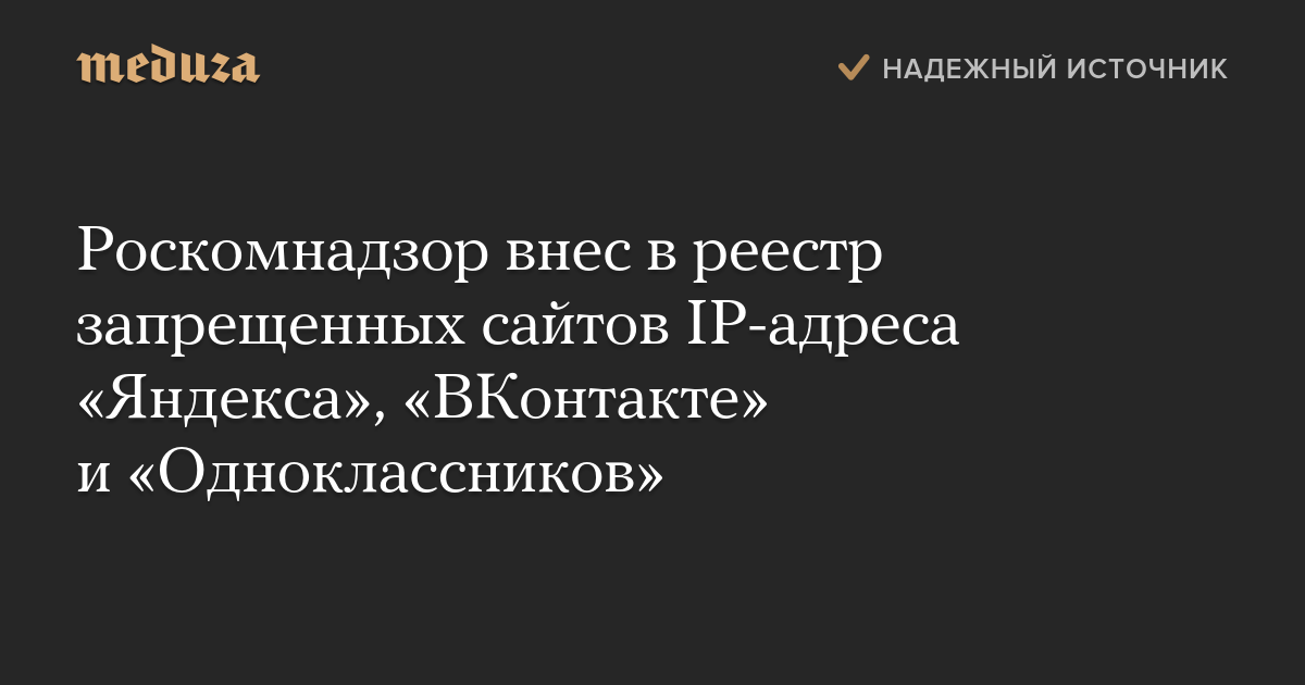 Роскомнадзор внес в реестр запрещенных сайтов IP-адреса «Яндекса», «ВКонтакте» и «Одноклассников»