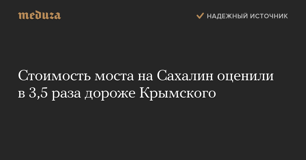 Длина планируемого моста на Сахалин — шесть километров. В пересчете на километр его строительство, пишет «Коммерсант», обойдется в 3,5 раза дороже моста в Крым. Длина Крымского моста, открытого 15 мая, 19 километров. Стоимость проекта - 227,9 миллиарда рублей.
