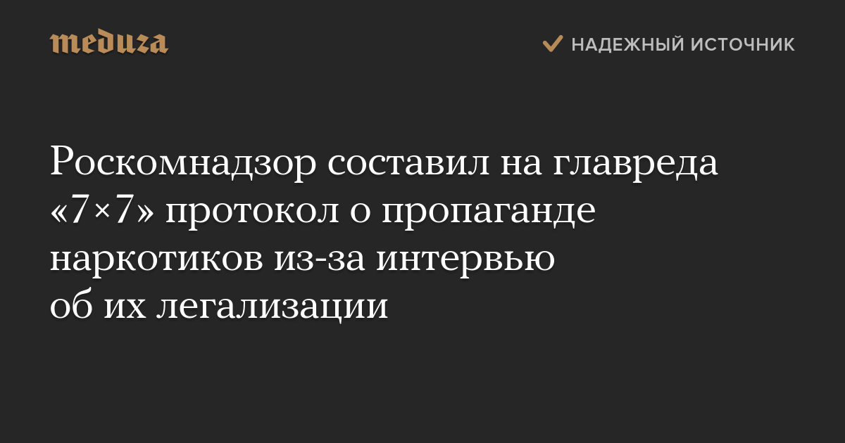 Роскомнадзор составил на главреда «7×7» протокол о пропаганде наркотиков из-за интервью об их легализации