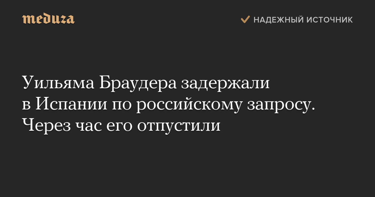 Обновление. Примерно через час после задержания Уильяма Браудера отпустили после того, как выяснилось, что ордер на его арест истек. Как заявил «Интерфаксу» представитель фонда Hermitage Capital, ранее Интерпол признал преследование Браудера в России политическим. Сам Браудер отметил, что российский запрос испанской полиции посоветовал не соблюдать генеральный секретарь Интерпола.