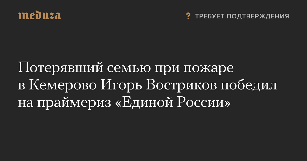 Потерявший семью при пожаре в Кемерово Игорь Востриков победил на праймериз «Единой России»