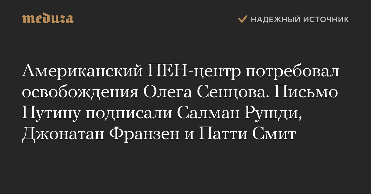 Американский ПЕН-центр потребовал освобождения Олега Сенцова. Письмо Путину подписали Салман Рушди, Джонатан Франзен и Патти Смит