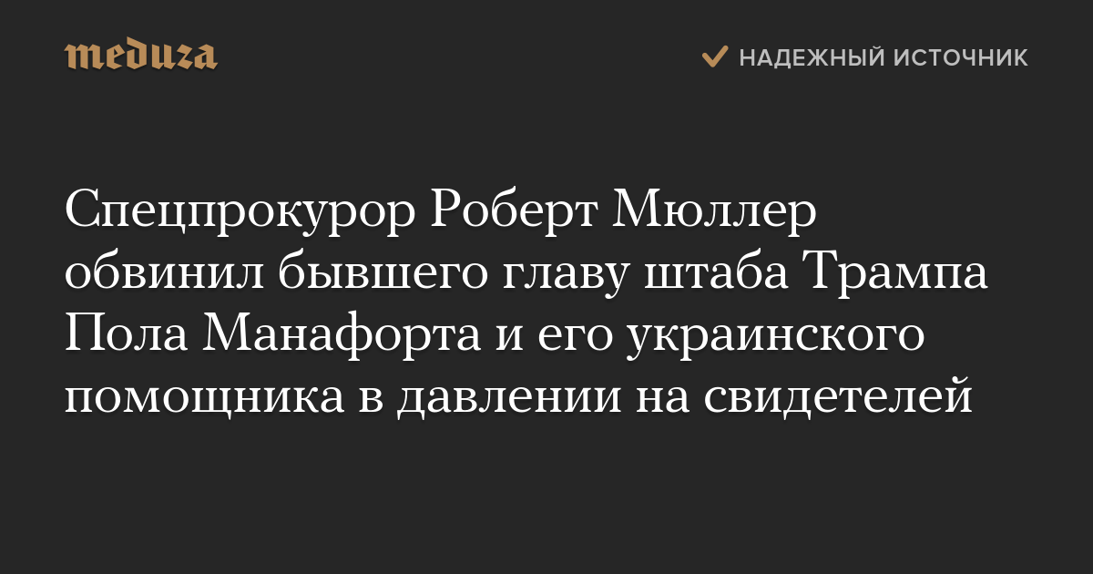 Спецпрокурор Роберт Мюллер обвинил бывшего главу штаба Трампа Пола Манафорта и его украинского помощника в давлении на свидетелей