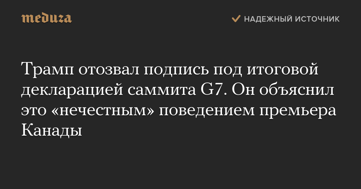 Свое решение Трамп объяснил поведением премьер-министра Канады Джастина Трюдо. Президент США заявил, что в личных разговорах с ним Трюдо был «кротким и мягким», однако как только Трамп покинул саммит, канадский лидер на пресс-конференции сделал очень жесткие заявления относительно пошлин США — это, по мнению Трампа, было «очень нечестно и слабо».