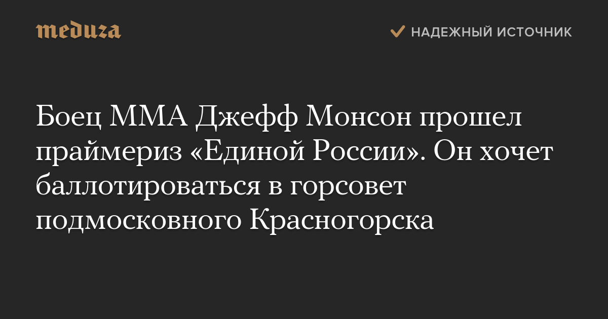 Боец смешанных единоборств Джефф Монсон прошел праймериз «Единой России» и получил возможность баллотироваться в совет депутатов городского округа Красногорск в Московской области. Об этом сам Монсон заявил на церемонии получения российского паспорта в Красногорске, сообщает «Интерфакс».