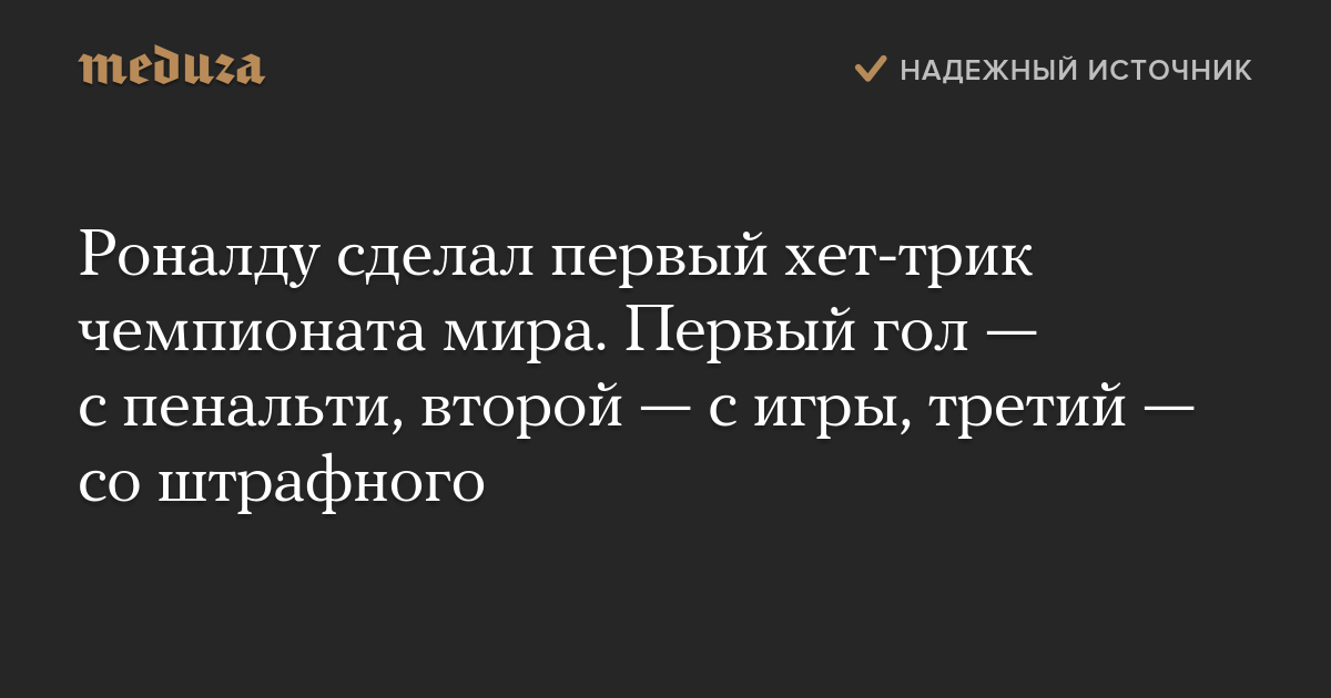 Роналду сделал первый хет-трик чемпионата мира. Первый гол — с пенальти, второй — с игры, третий — со штрафного