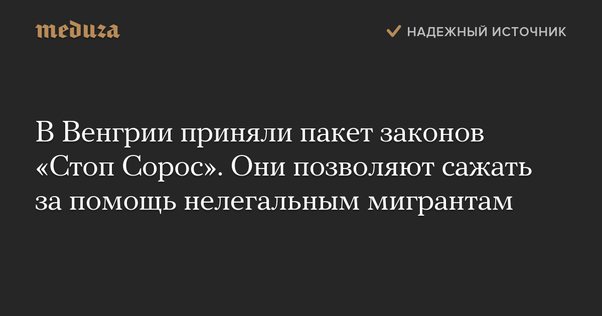 Законы «Стоп Сорос», в частности, предусматривают 12 месяцев тюрьмы за помощь нелегальным мигрантам в получении законного статуса в Венгрии или оказание им финансовой поддержки, сообщает The New York Times.