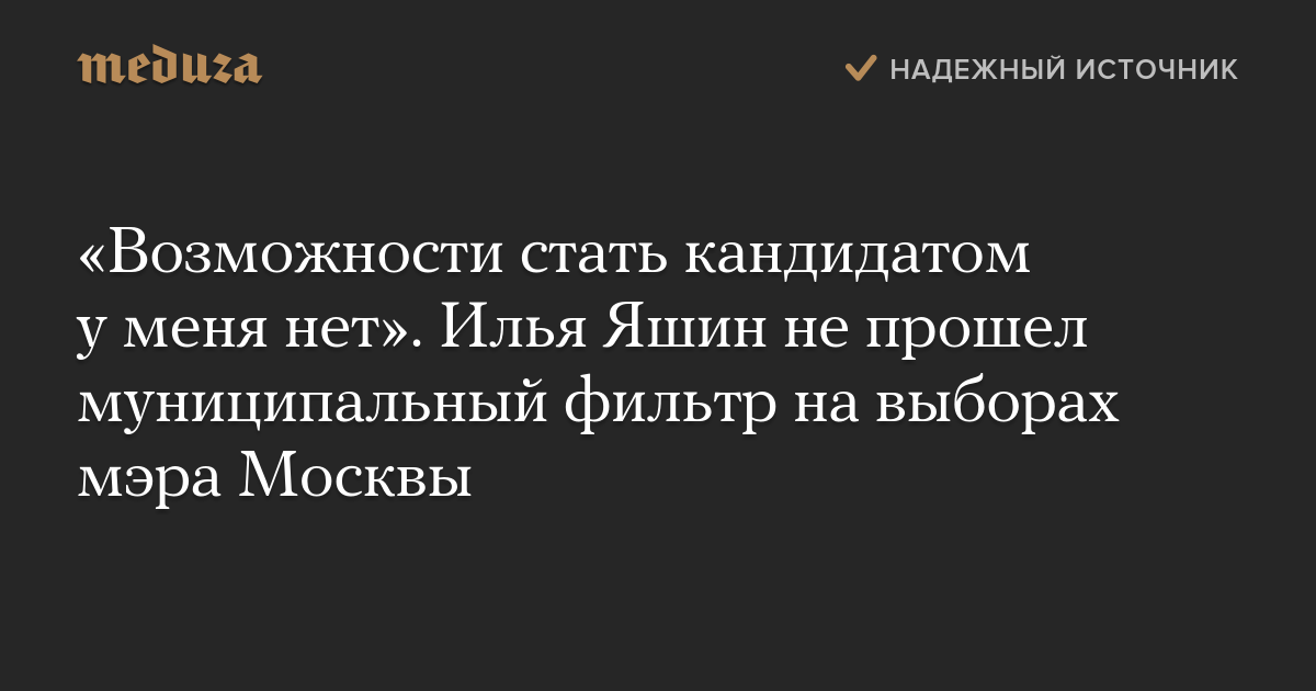 Глава совета депутатов Красносельского района, оппозиционер Илья Яшин признал, что не сможет добиться регистрации в качестве кандидата в мэры Москвы. Об этом он написал в своем фейсбуке.