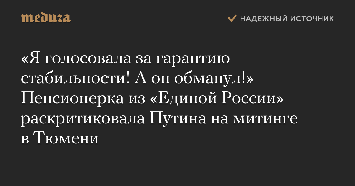 «Я голосовала за гарантию стабильности! А он обманул!» Пенсионерка из «Единой России» раскритиковала Путина на митинге в Тюмени