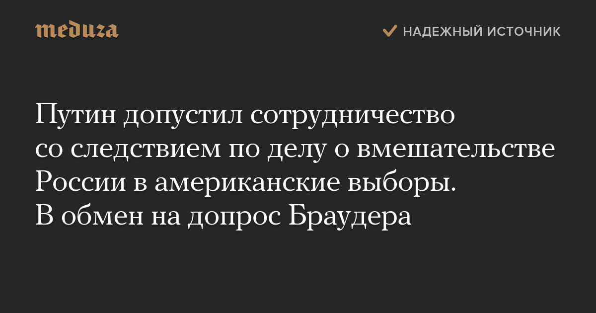 Путин допустил сотрудничество со следствием по делу о вмешательстве России в американские выборы. В обмен на допрос Браудера