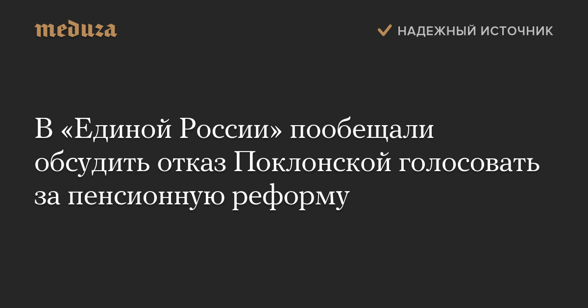«Единая Россия» накануне обсуждения проекта пенсионной реформы приняла решение о «консолидированном голосовании „за“». Поклонская публично заявляла, что не поддержит законопроект.