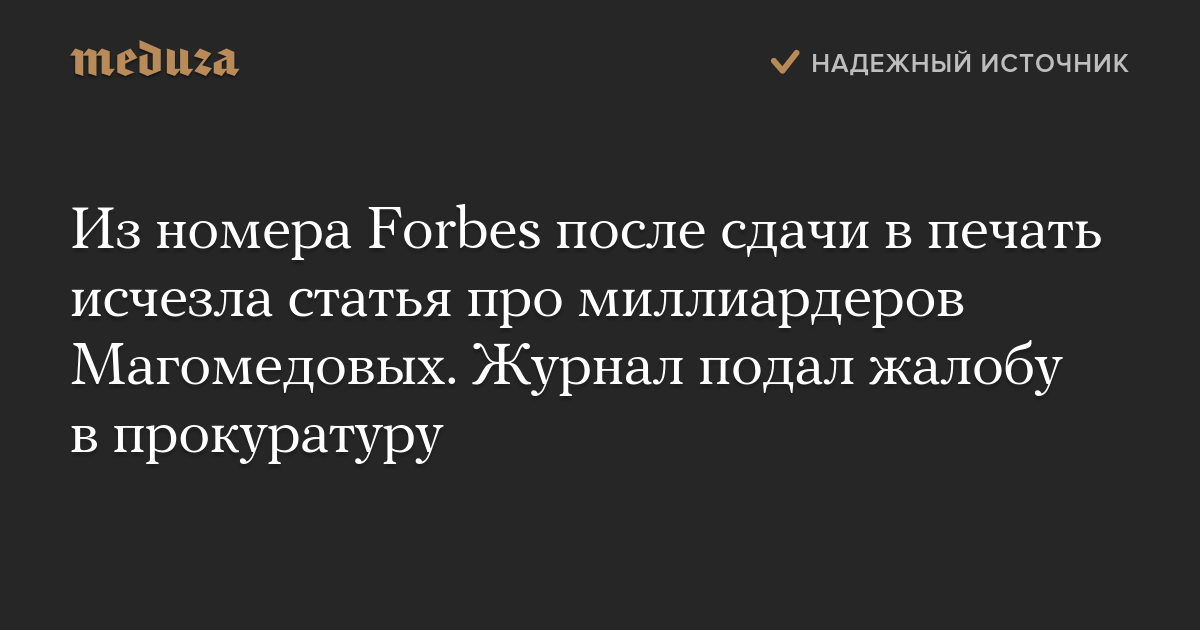 Из номера Forbes после сдачи в печать исчезла статья про миллиардеров Магомедовых. Журнал подал жалобу в прокуратуру
