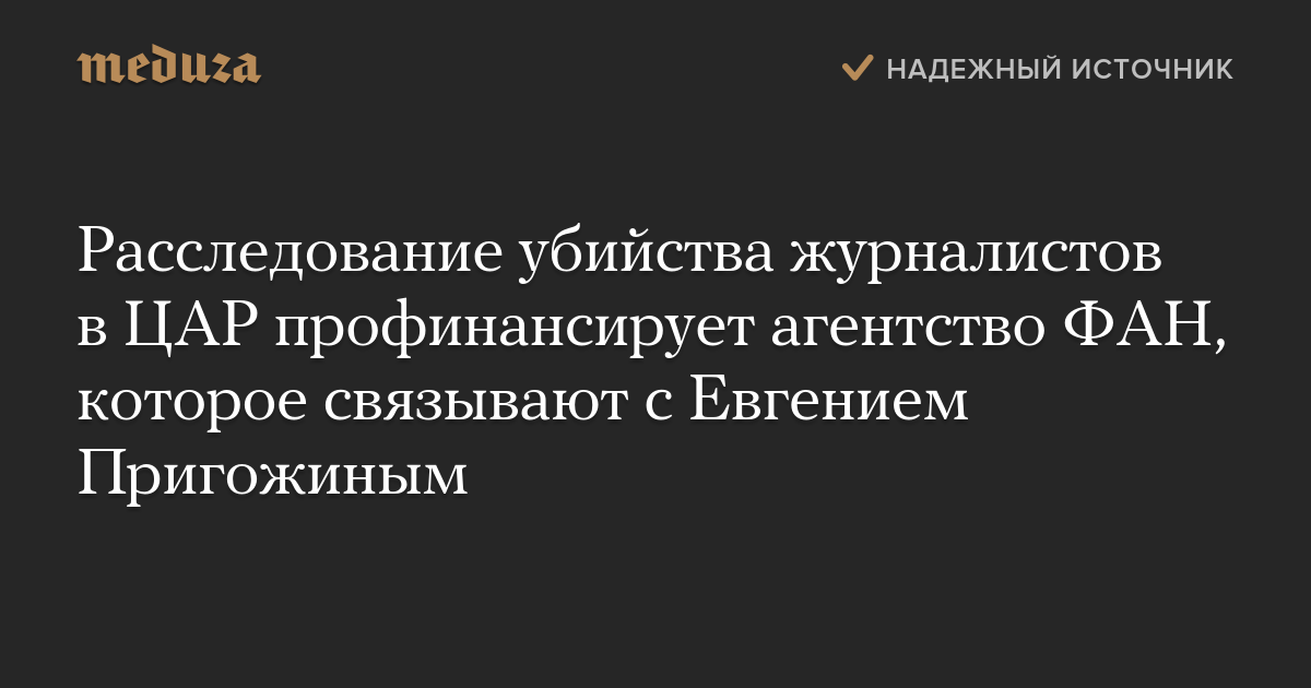 РБК связывало РИА ФАН с бизнесменом Евгением Пригожиным, который также считается спонсором организации наемников ЧВК «Вагнер» — именно о присутствии ЧВК в ЦАР собирались снимать фильм погибшие журналисты.