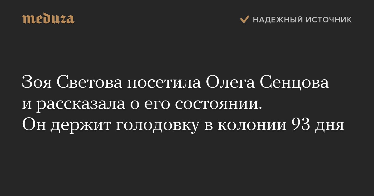 Зоя Светова посетила Олега Сенцова и рассказала о его состоянии. Он держит голодовку в колонии 93 дня
