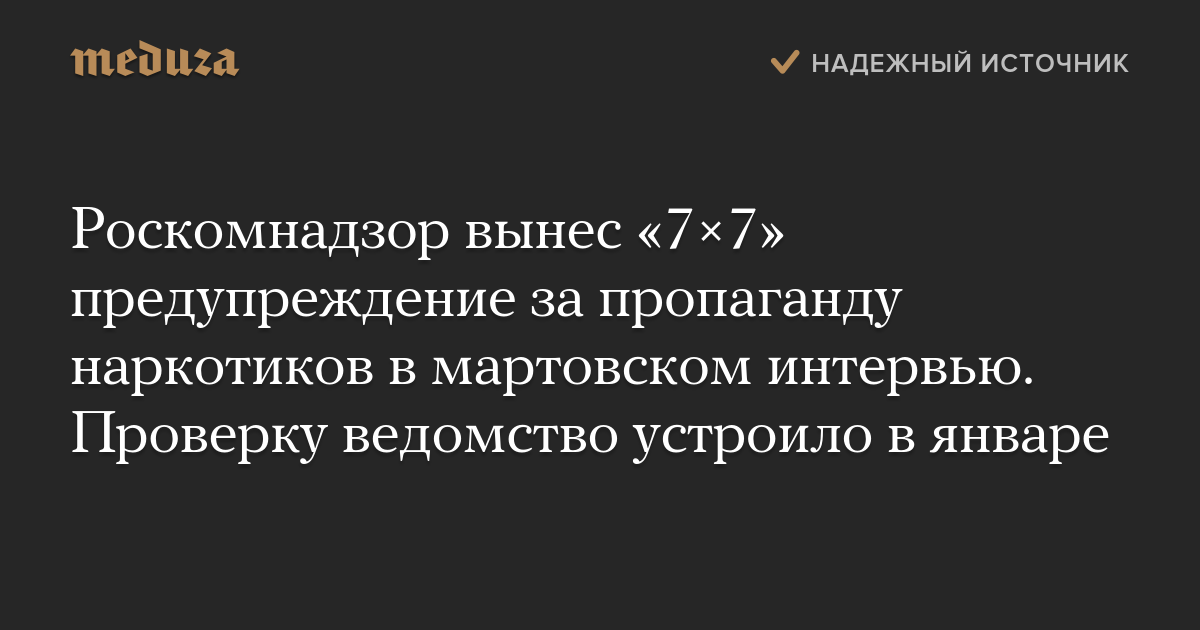 Роскомнадзор вынес «7×7» предупреждение за пропаганду наркотиков в мартовском интервью. Проверку ведомство устроило в январе