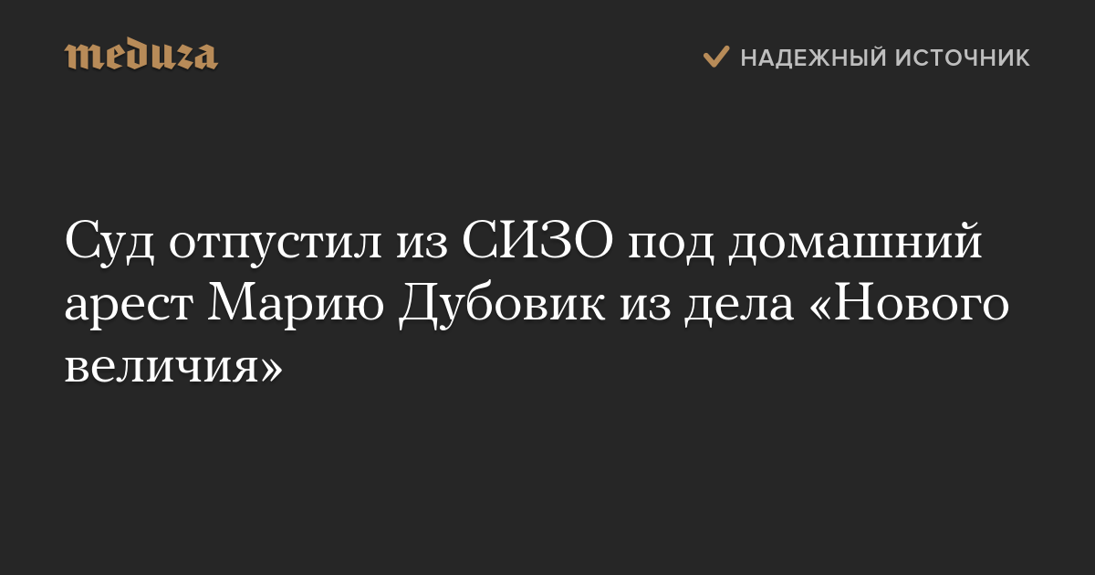 Дорогомиловский суд Москвы изменил 19-летней Марии Дубовик, обвиняемой по делу «Нового величия», меру пресечения с содержания в СИЗО на домашний арест, пишет «Интерфакс».