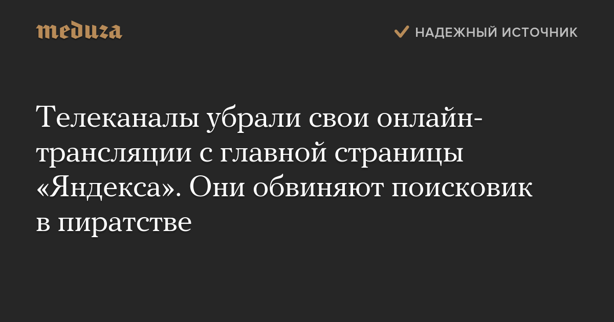 По данным издания, транслировать свои каналы на «Яндексе» отказались «Газпром-медиа» и «Национальная медиа группа». Таким образом они решили выступить против пиратских версий своего контента в поисковой выдаче «Яндекса».