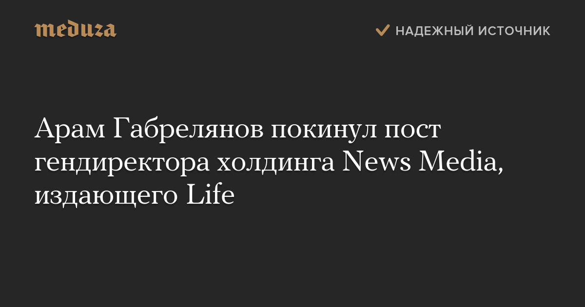 Арам Габрелянов покинул пост генерального директора холдинга News Media, управляющего изданием Life. Новым гендиректором станет заместитель Габрелянова Анатолий Сулейманов.