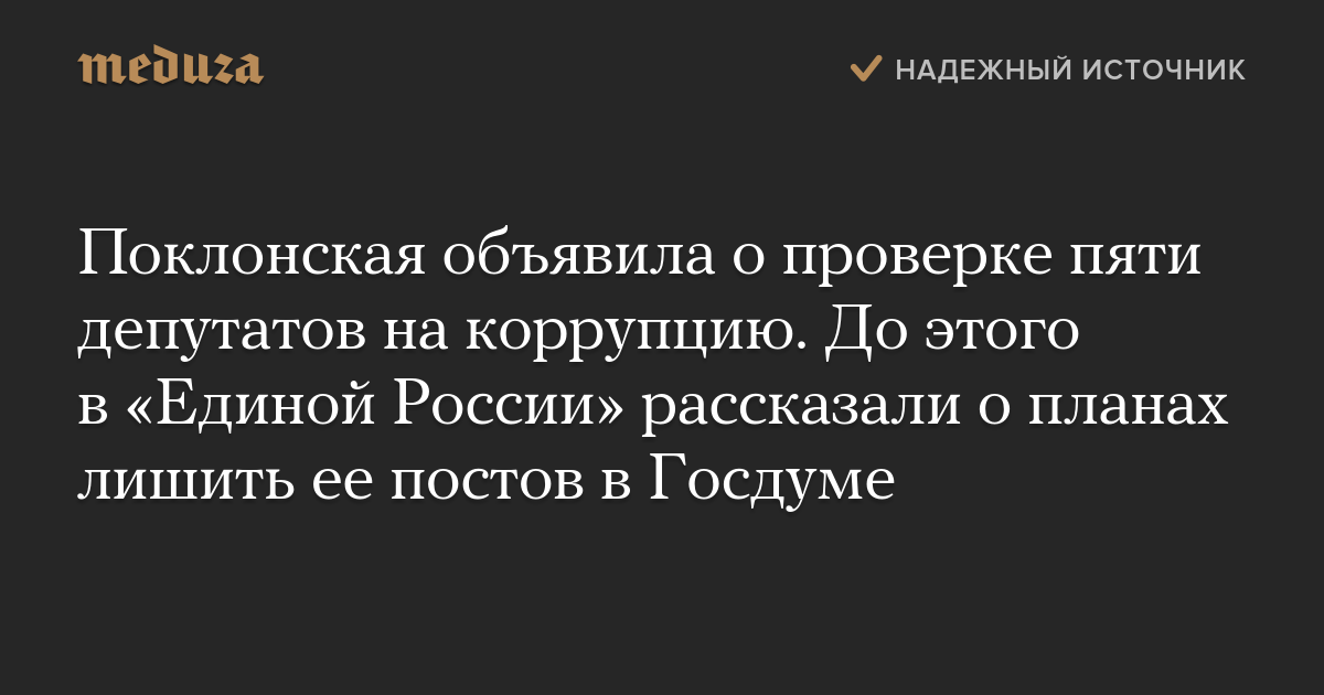 Депутат Госдумы Наталья Поклонская, возглавляющая в парламенте комиссию по доходам, объявила о проверке пяти депутатов из фракций «Единая Россия» и «Справедливая Россия» в связи с возможным нарушением закона о противодействии коррупции.