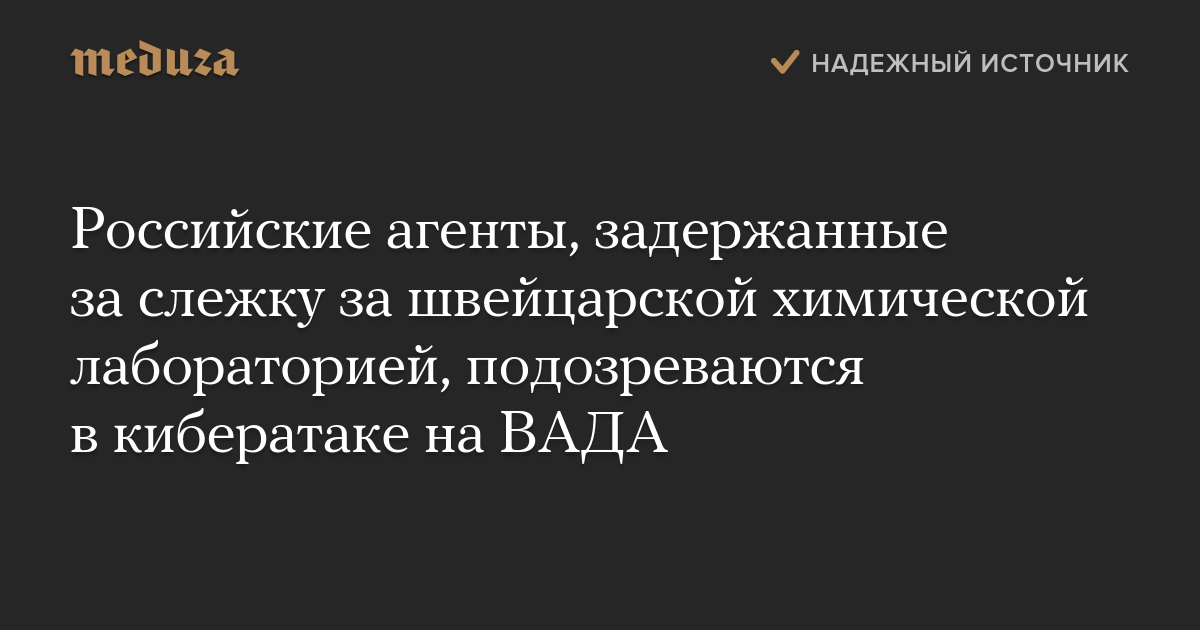 Двое российских агентов, которых задержали за попытку слежки за швейцарской лабораторией Spiez и выслали в РФ, подозреваются по делу о кибератаке на Всемирное антидопинговое агентство (ВАДА). Эту информацию журналистам подтвердили в прокуратуре Швейцарии.