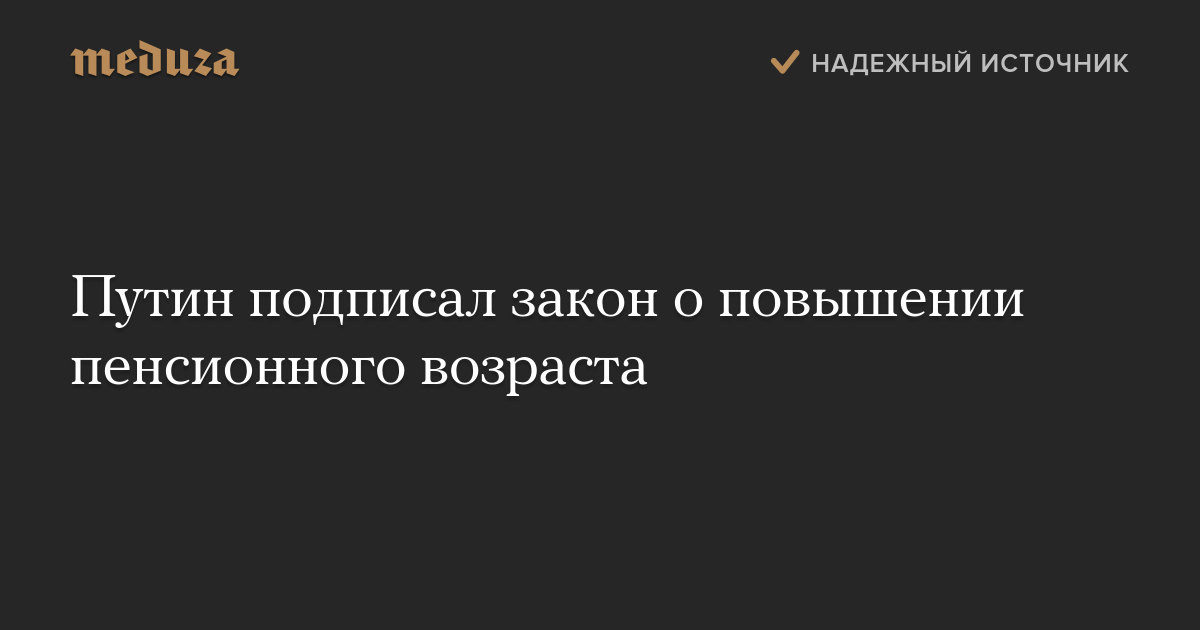 Президент России Владимир Путин подписал закон о повышении пенсионного возраста, который Совет Федерации одобрил 3 октября.
