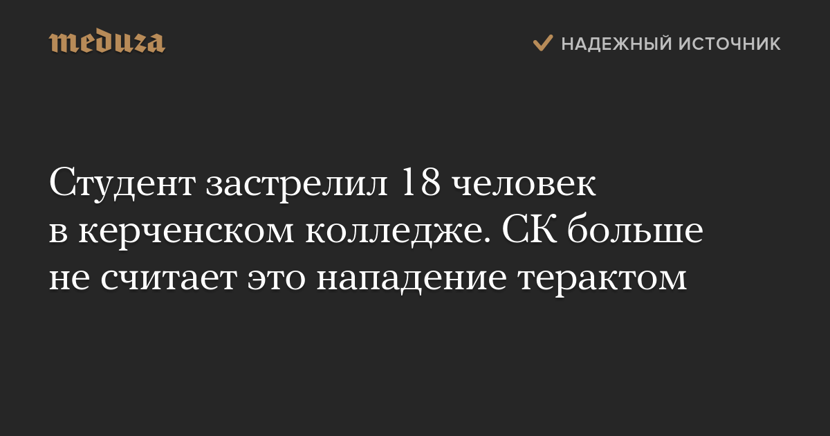 Следственный комитет переквалифицировал дело о нападении на политехнический колледж в Керчи со статьи «теракт» (статья 205 УК РФ) на «убийство двух и более лиц общеопасным способом» (часть 2 статьи 105 УК РФ).