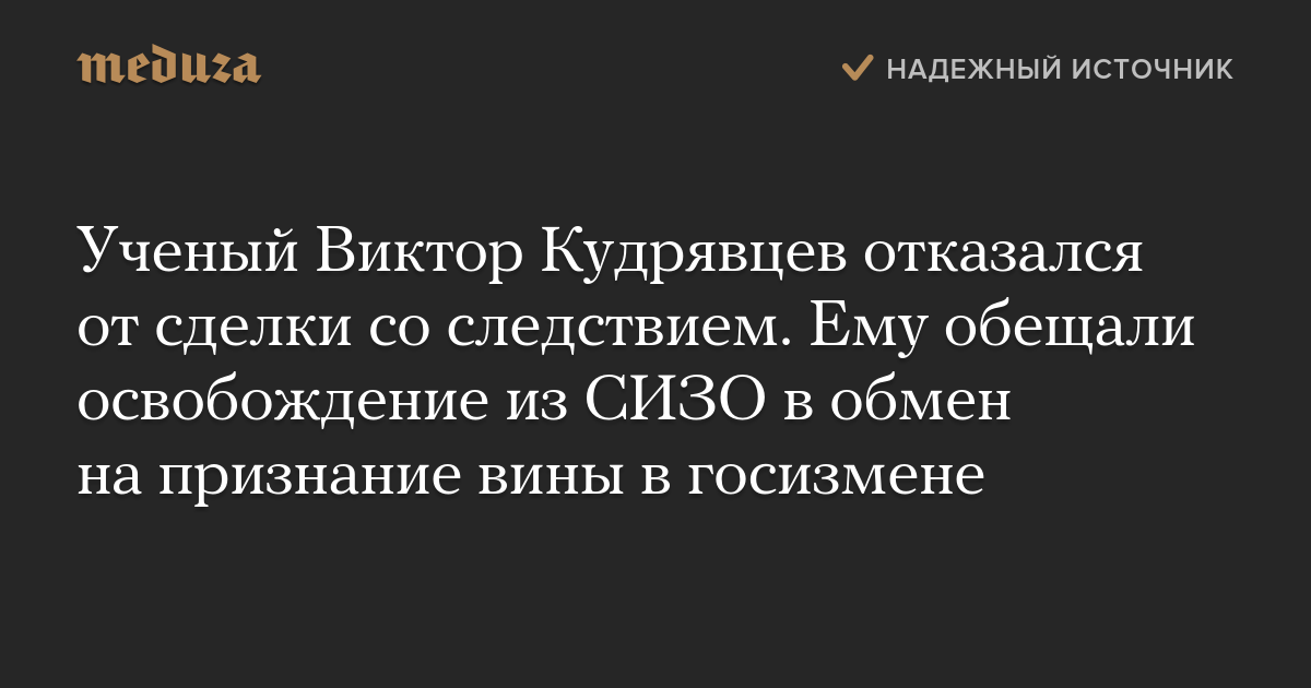 Ученый Виктор Кудрявцев, обвиняемый в госизмене, отказался от сделки со следствием. Об этом сообщил его адвокат Иван Павлов.