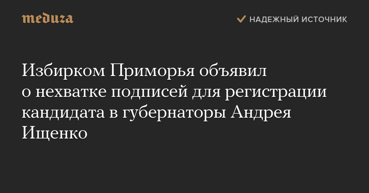 Избирательная комиссия Приморского края не засчитала подписи депутатов, поддержавших самовыдвиженца Андрея Ищенко при регистрации кандидатом в губернаторы, сообщает «Интерфакс» со ссылкой на избирком.