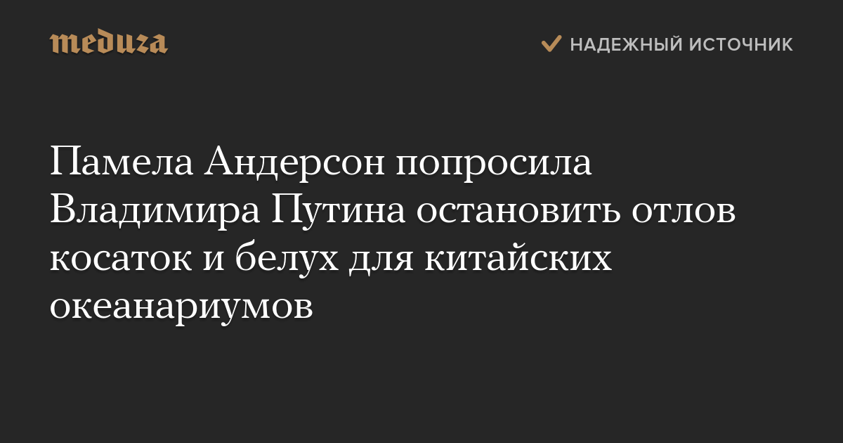 Актриса и зоозащитница Памела Андерсон написала президенту России Владимиру Путину письмо с просьбой остановить отлов диких косаток и белух для продажи в китайские океанариумы. Об этом Андерсон сообщила на сайте своего благотворительного фонда.