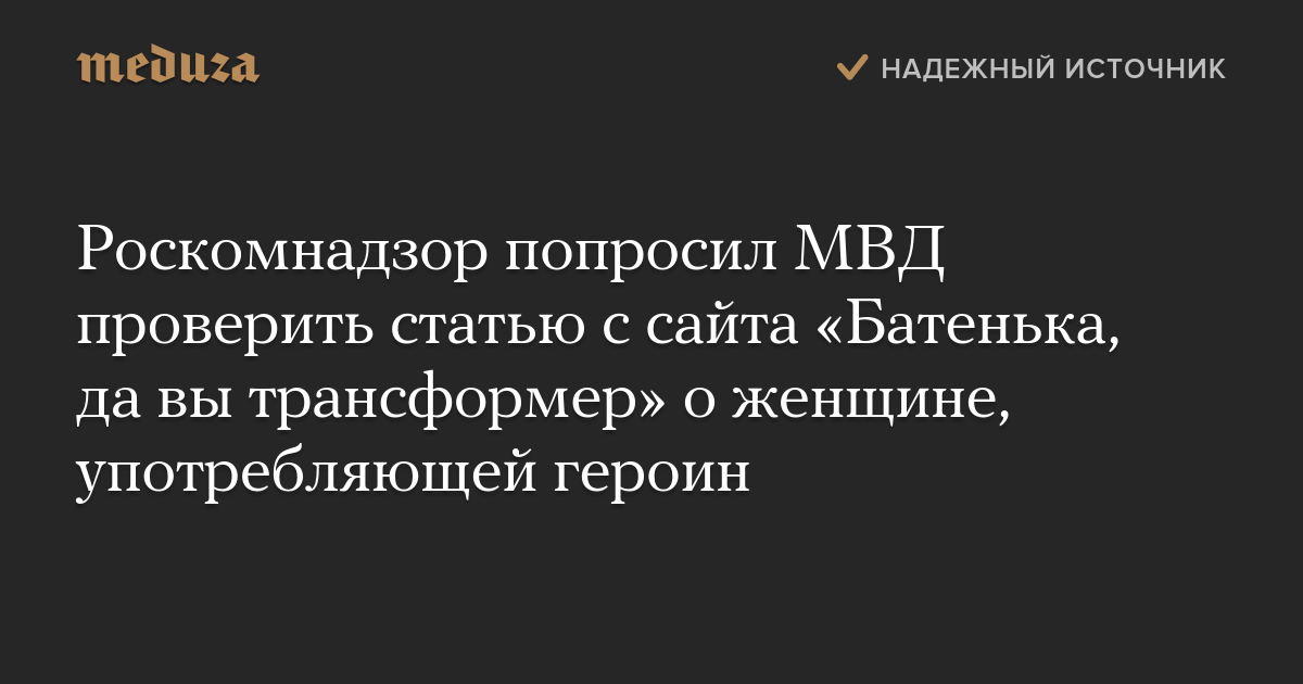 Роскомнадзор попросил МВД проверить статью с сайта «Батенька, да вы трансформер» о женщине, употребляющей героин