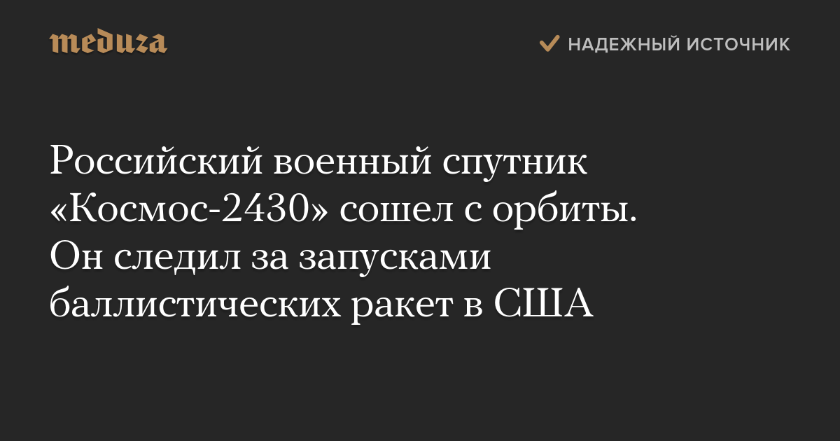 Российский военный спутник «Космос-2430» сошел с орбиты. Он следил за запусками баллистических ракет в США
