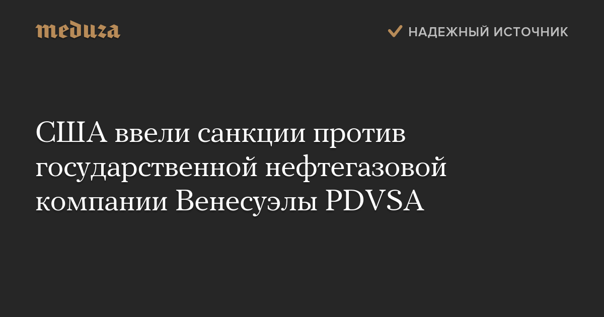 Минфин США объявил о введении санкций против государственной нефтегазовой компании Венесуэлы PDVSA и заморозке активов этой компании на сумму 7 миллиардов долларов.